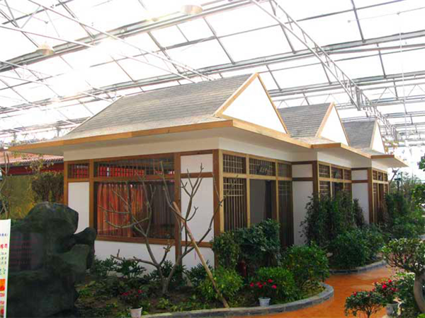 綠色生態餐廳完全按照標準溫室的結構建造,多采用文洛式,覆蓋材料多為PC板或者玻璃,結構保溫性能好,整齊規范,室內各個空間溫度均勻,有利于景觀植物的生長,鑒于餐飲布局的需要,在文洛溫室結構的基礎上,可進行局部調整。該溫室建造成本相對較低,溫室升降溫能耗低,節約后期運行費用。
