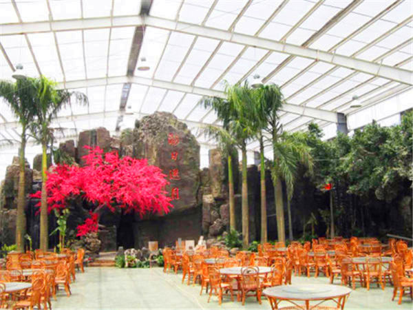 綠色生態餐廳完全按照標準溫室的結構建造,多采用文洛式,覆蓋材料多為PC板或者玻璃,結構保溫性能好,整齊規范,室內各個空間溫度均勻,有利于景觀植物的生長,鑒于餐飲布局的需要,在文洛溫室結構的基礎上,可進行局部調整。該溫室建造成本相對較低,溫室升降溫能耗低,節約后期運行費用。