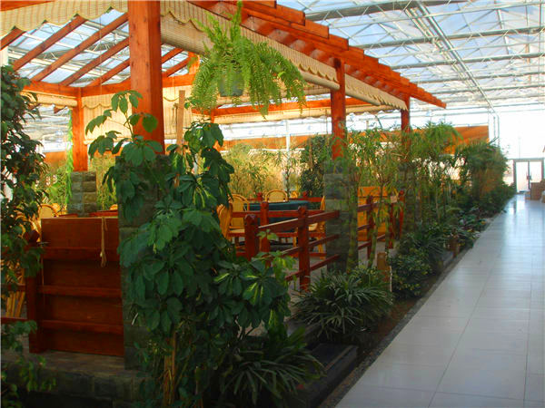 綠色生態(tài)餐廳完全按照標(biāo)準(zhǔn)溫室的結(jié)構(gòu)建造,多采用文洛式,覆蓋材料多為PC板或者玻璃,結(jié)構(gòu)保溫性能好,整齊規(guī)范,室內(nèi)各個空間溫度均勻,有利于景觀植物的生長,鑒于餐飲布局的需要,在文洛溫室結(jié)構(gòu)的基礎(chǔ)上,可進行局部調(diào)整。該溫室建造成本相對較低,溫室升降溫能耗低,節(jié)約后期運行費用。