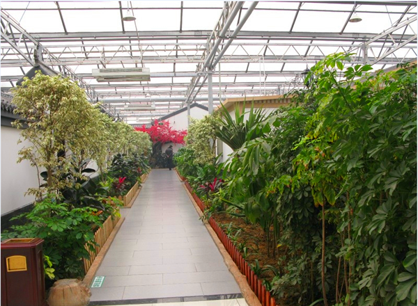 綠色生態餐廳完全按照標準溫室的結構建造,多采用文洛式,覆蓋材料多為PC板或者玻璃,結構保溫性能好,整齊規范,室內各個空間溫度均勻,有利于景觀植物的生長,鑒于餐飲布局的需要,在文洛溫室結構的基礎上,可進行局部調整。該溫室建造成本相對較低,溫室升降溫能耗低,節約后期運行費用。